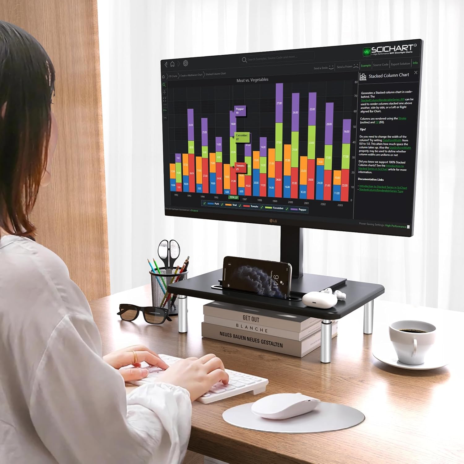 Monitor stand for desk can adjust the monitor height to eye level, reducing neck and eye strain, improving posture, and enhancing focus and work efficiency.