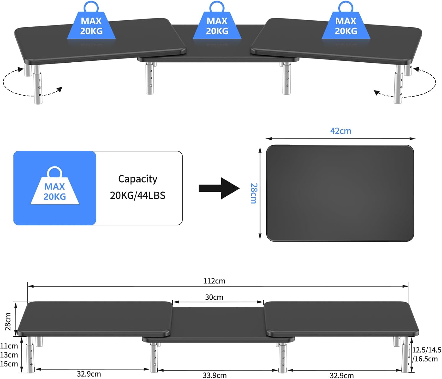 This monitor stand can be adjusted to 10cm, 12cm & 14cm to meet the needs of different people, locks secure the adjusted height.